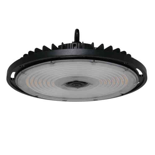 Round High Bay HBRSR. Field selectable Lumen and Kelvin (4000K/ 5000K) settings. Tri-lumen selectable drivers control the 16,000 to 35,000 nominal lumen emission range. Long-life LEDs L70 rating of 146,000 hours of operation. 0-10VDC dimming drivers are standard. Motion detection screw-in sensor equipped. Round High Bay Light operates on Universal 120-277V AC voltage (50-60Hz). Two HBRSR die cast aluminum housing diameters, 10 & 13.6 inches available in white or black, Fitted with a polycarbonate lens.
